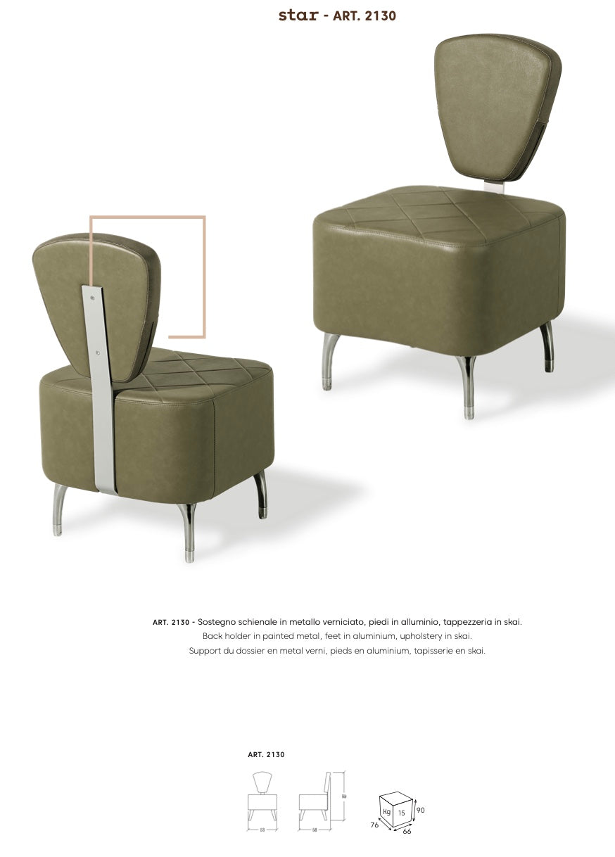 Der Wartezimmerstuhl Star ist vollständig mit Skai gepolstert und hat eine lackierte Metallrückenlehne und Aluminiumfüße. Ein gesteppter Hocker mit einer funktionalen und unauffälligen Rückenlehne kann dem Friseursalon ein stilvolles und zugleich lustiges Aussehen verleihen.