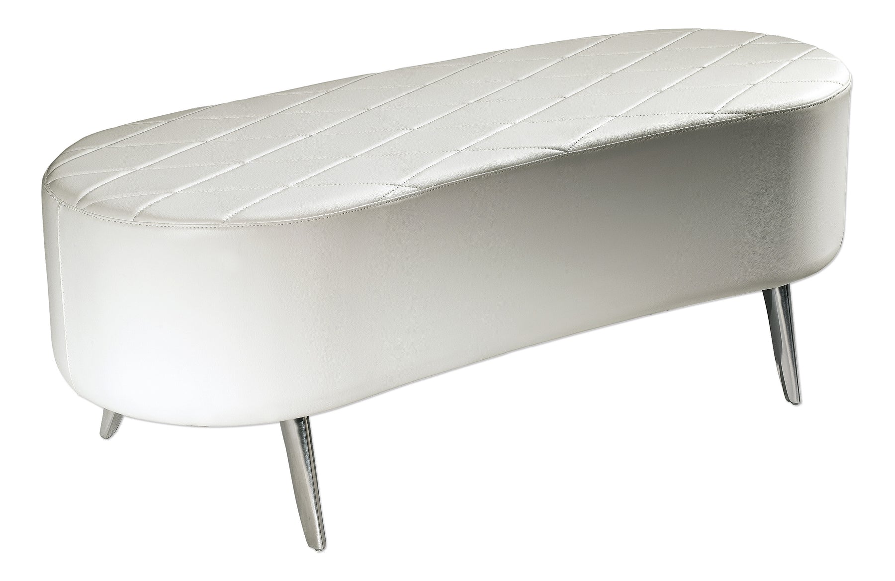 Der Bacello ist ein zweisitziger Hocker mit Skai-Bezug und Aluminiumfüßen. Dieses kleine Sofa eignet sich perfekt für den Wartebereich in einem Geschäft. Mit seinen abgerundeten, geschwungenen Linien und der gesteppten Oberfläche ist er das perfekte Element, um die Gäste im Salon zu empfangen.