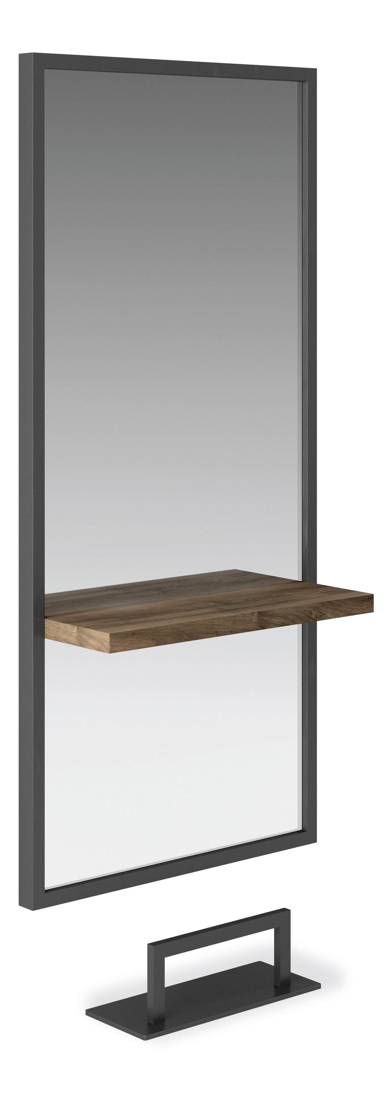 Die Industrial Collection Workstation ist ein Einzelarbeitsplatz für Friseure und Friseurläden mit einem an der Wand montierten Spiegel. Dieser Friseurarbeitsplatz besteht aus einer mattschwarz lackierten Eisenstruktur mit einer Arbeitsplatte aus Holzlaminat in pazifischem Nussbaum und einer lackierten Metallfußstütze.