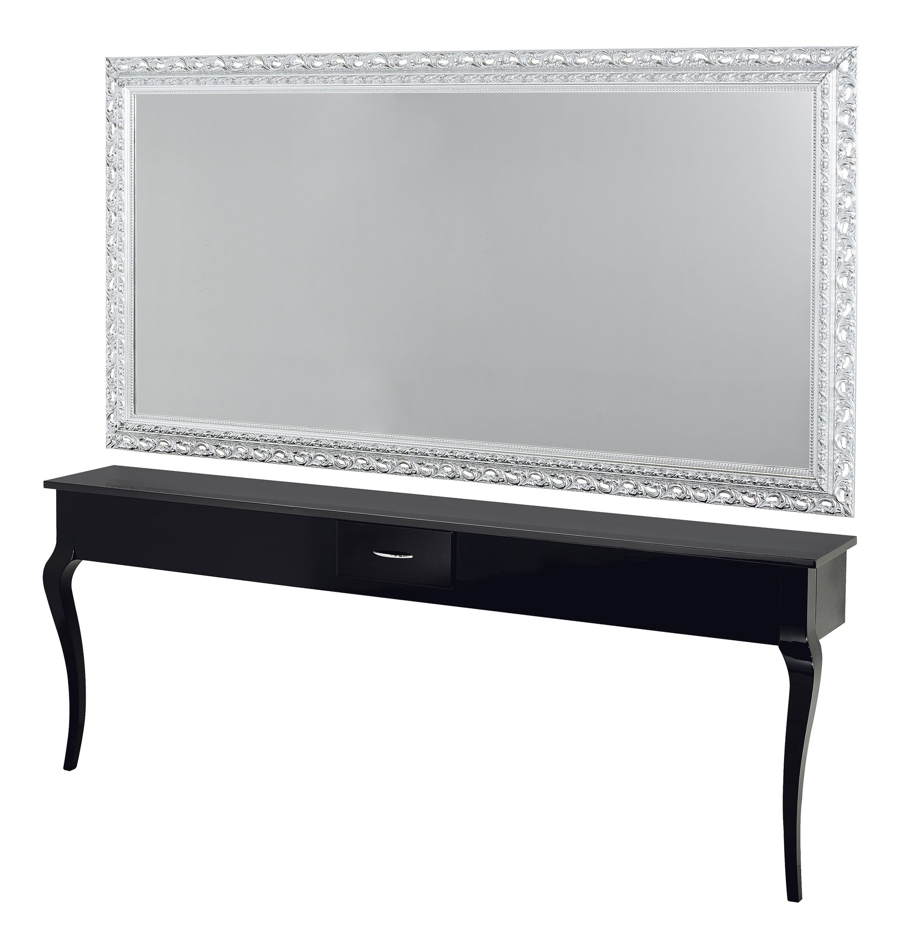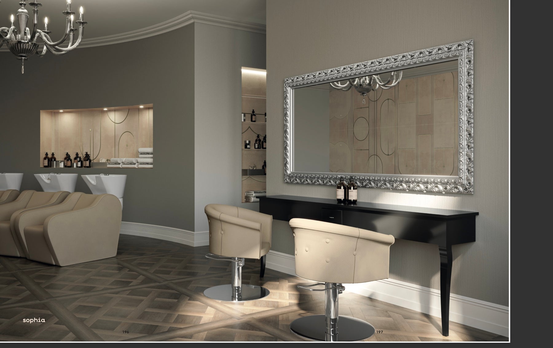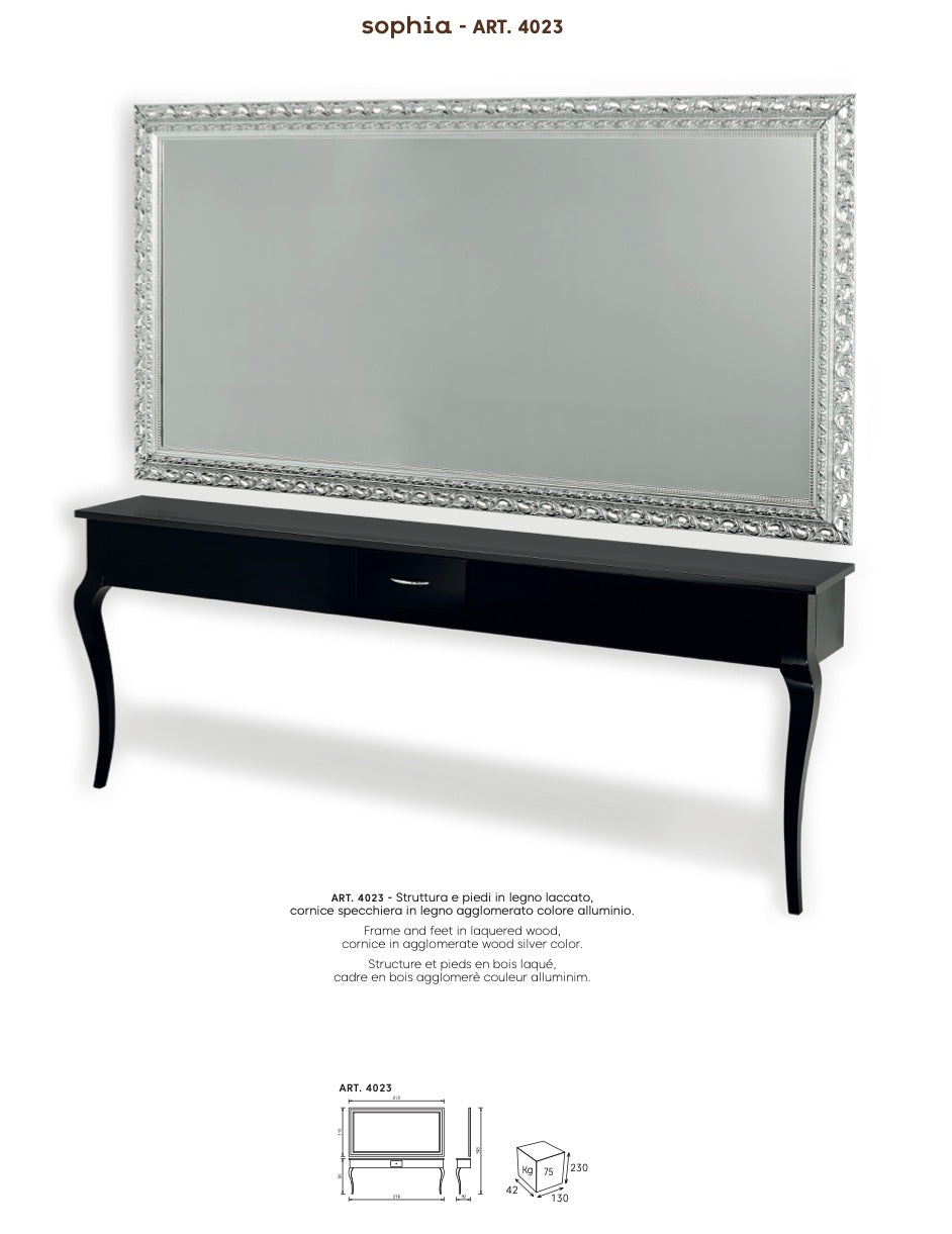 Sophia ist unser Doppelarbeitsplatz mit Struktur und Füßen aus lackiertem Holz und einem Rahmen aus aluminiumfarbenem Agglomeratholz. Der große Spiegel, der durch den prächtigen Rahmen verziert wird, erinnert an die Möbel der Vergangenheit und macht den Salon zu einem vertrauten Ort, an dem man sich verwöhnen lassen kann. Ein charakteristischer Arbeitsplatz nicht nur wegen seiner antiken Wirkung, sondern auch wegen seiner Praktikabilität und Funktionalität, die die Arbeit des Friseurs vereinfachen kann.