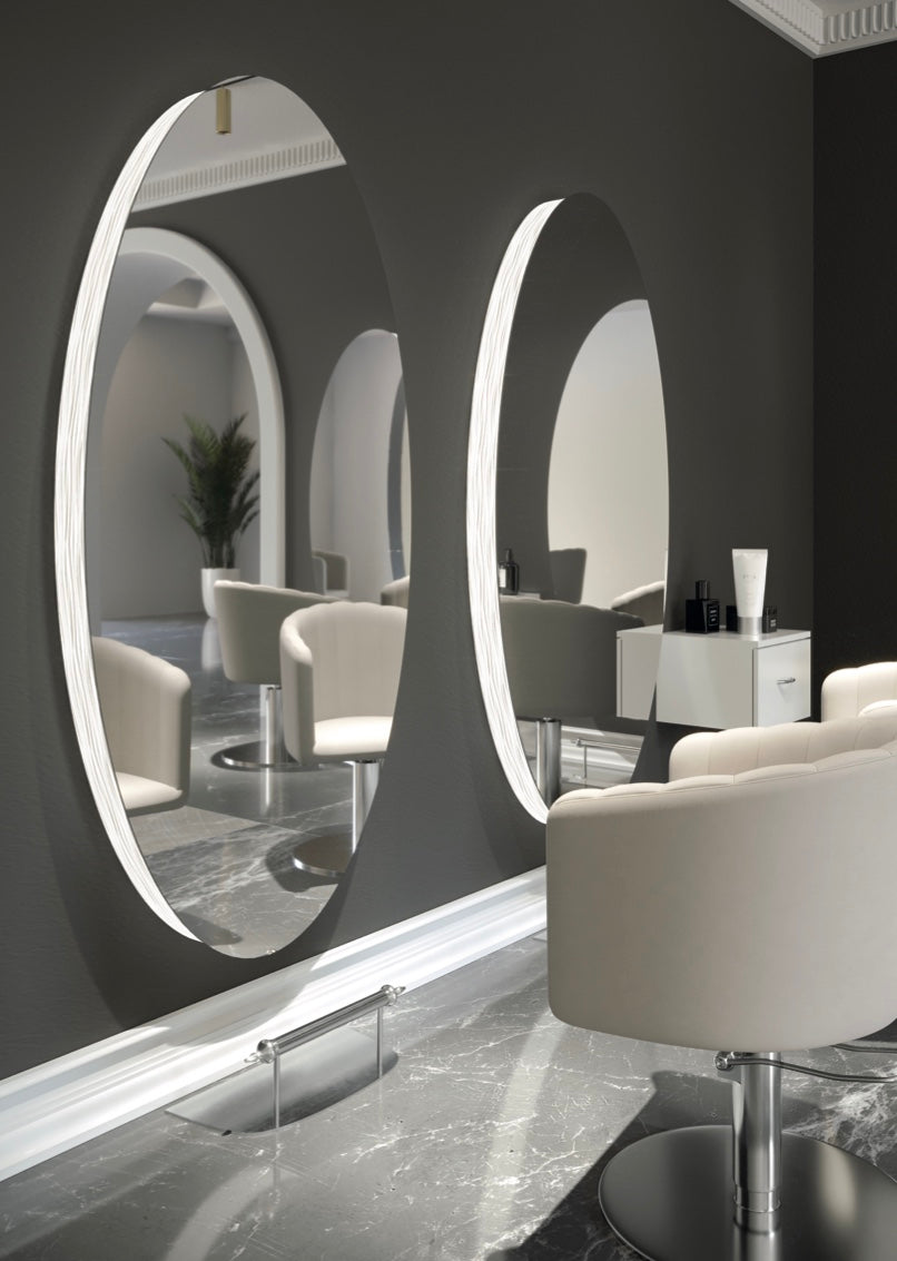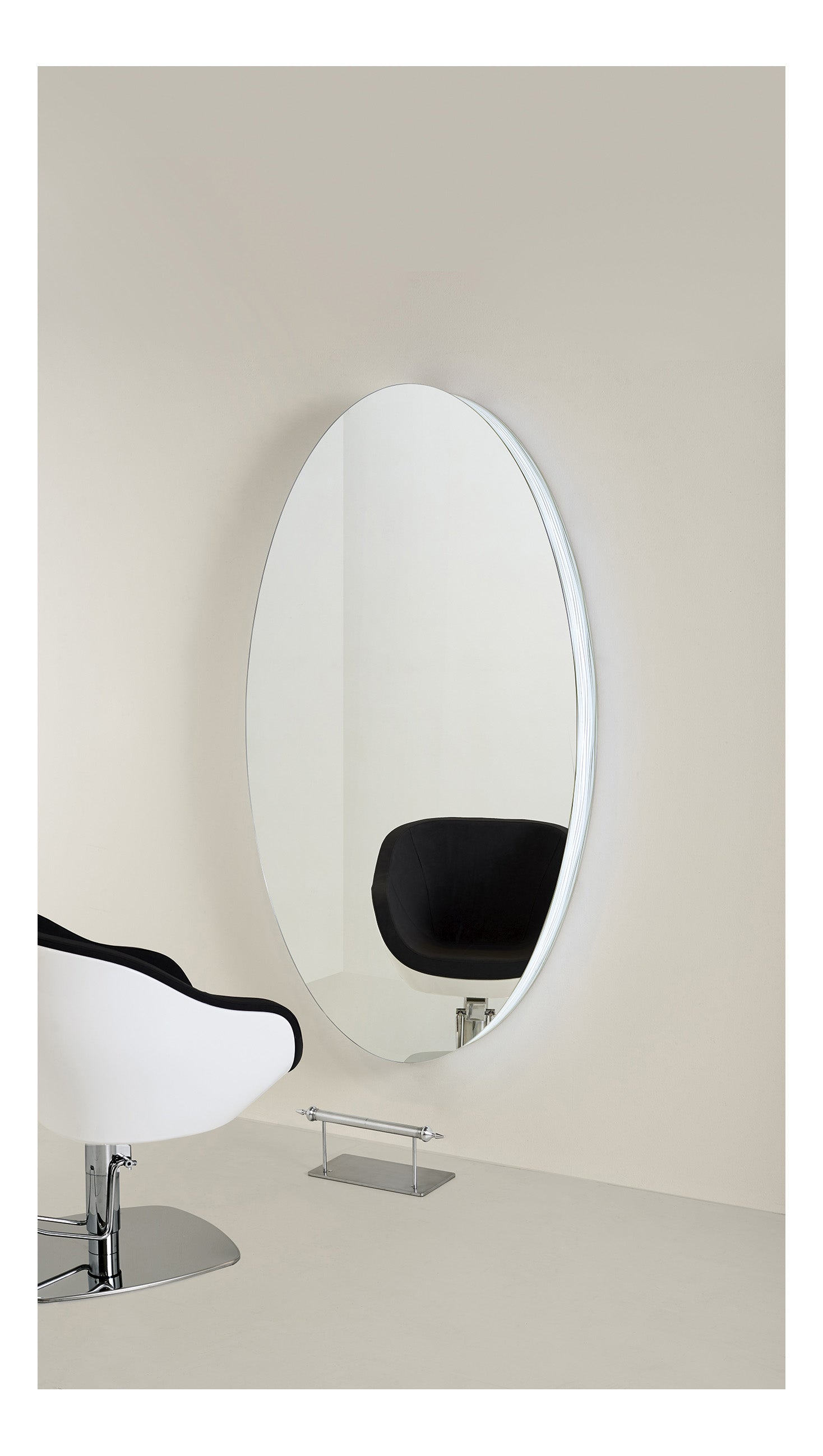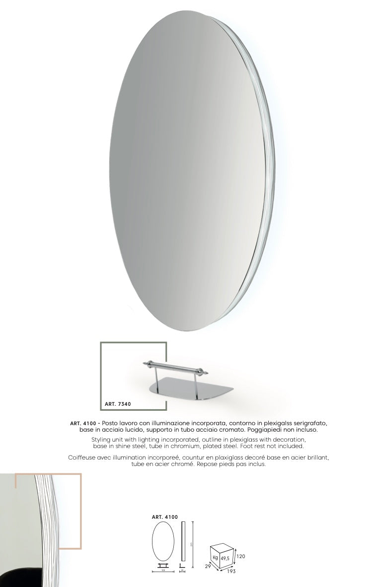 Der Kleopatra-Wandarbeitsplatz zeichnet sich durch eine siebgedruckte Plexiglasumrandung, eine eingebaute Beleuchtung, einen Sockel aus poliertem Stahl und ein verchromtes Stahlrohrgestell aus. Ein großer runder Spiegel, inspiriert von der berühmtesten ägyptischen Königin, der jeden Salon, in dem er aufgestellt wird, aufwertet und verschönert.