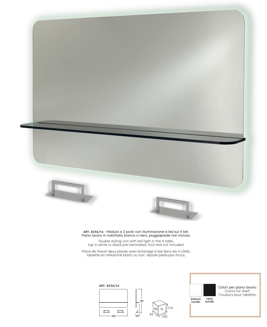 Unser Schneideplatzmodul Dos Light zeichnet sich durch einen Doppelarbeitsplatz mit LED-Beleuchtung auf allen 4 Seiten und einer Arbeitsfläche aus Melamin aus. Die vollständige Beleuchtung auf allen Seiten macht diesen großen Spiegel elegant und funktional, perfekt für einen modernen und klassischen Stil Salon.