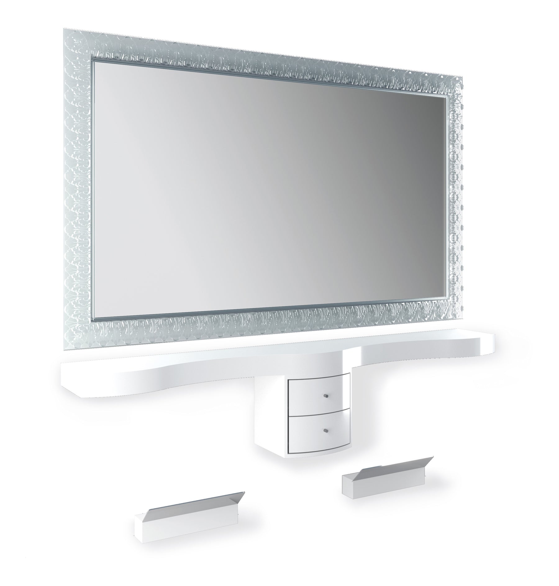 Epoque Wall ist ein Gussglas-Spiegel mit einer extra klaren Glasoberfläche. Der zentrale Spiegel hat eine polierte Kante mit eingebauter LED-Beleuchtung und eine Arbeitsplatte aus Laminat. Fußstützen sind im Lieferumfang enthalten.