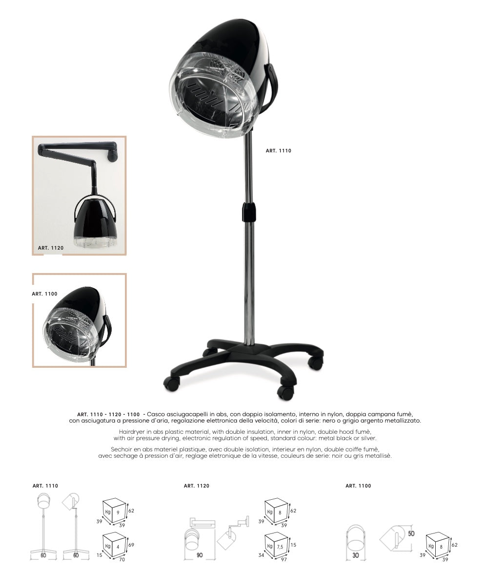 Ginko ist ein praktischer Abs-Trocken-Helm mit doppelter Isolierung und Nylon-Innenausstattung. Er ist mit einer doppelten Rauchglocke mit Luftdrucktrocknungssystem und elektronischer Drehzahlregelung ausgestattet. Es ist in schwarz oder silbergrau metallic erhältlich.
