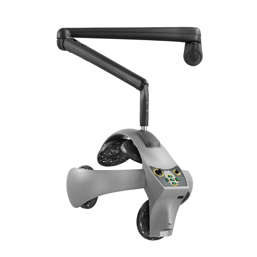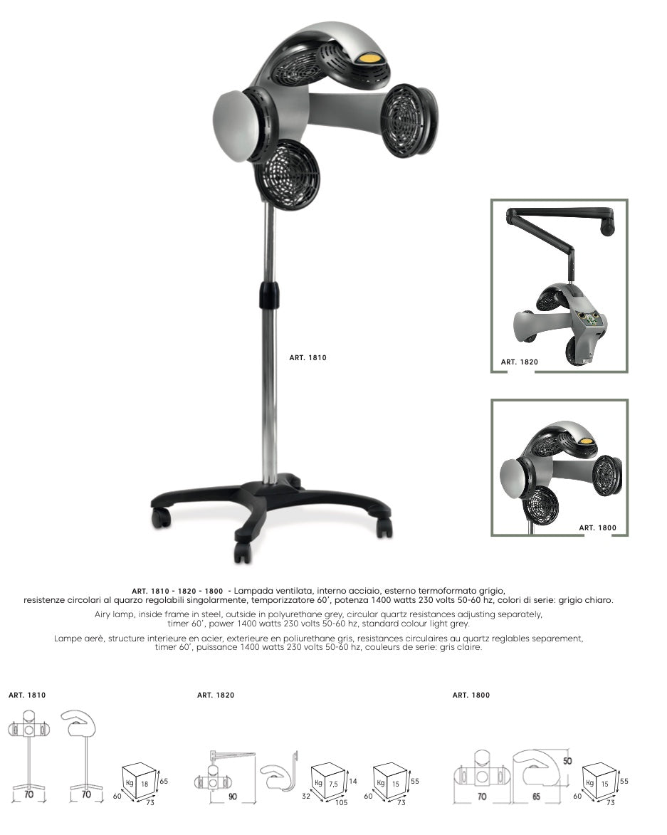 Belüftete Lampe mit Innenseite aus Stahl und grauer thermogeformter Außenseite. Luce' ist die Profi-Lampe mit individuell einstellbaren runden Quarz-Heizelementen und 60'-Timer. Er leistet 1400 Watt, 230 Volt, 50-60 Hz. Erhältlich in Hellgrau.
